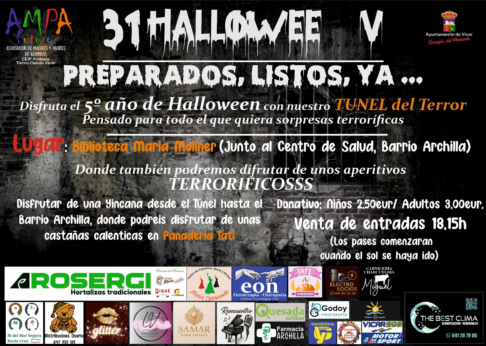 Por segundo año consecutivo, el primer pase del Túnel del Terror del Barrio Archilla, se hará sin sonido ni luces estroboscópicas. Una iniciativa especialmente dirigida a los niños con espectro autista para que puedan disfrutar del espectáculo con comodidad. Para ello, habrá que reservar telefónicamente con antelación a través de los teléfonos 686120040 y 622171982. La venta de entradas comenzará a las seis y cuarto de la tarde, del día 31, y por el precio de 3€, para los adultos y 2,50 para los niños, se podrá entrar al espectacular túnel del terror, para disfrutar después de aperitivos “terroríficos”. Más tarde, comenzará una gincana desde el túnel hasta el barrio que finalizará con la degustación de castañas por cortesía de la Panadería Tati. Finalmente tendrá lugar el tradicional recorrido de los niños por las casas del barrio pidiendo caramelos.